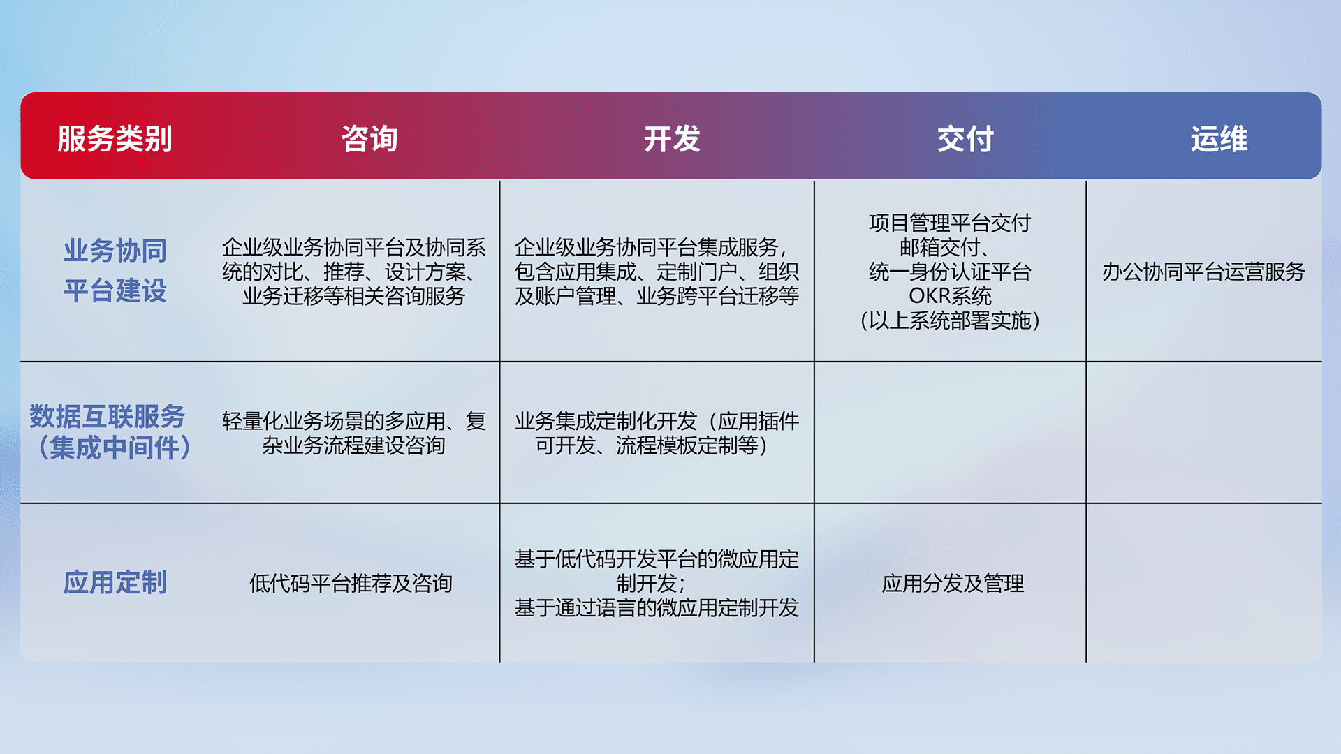 针对钉钉、、、、企微、、IDaas等平台级产品提供产品的规划、、、、方案、、、交付、、、、定制化开发等服务,,实现如统一协同办公、、、、智能客户服务、、、、混合会议管理、、智能数据查询、、、等业务场景,,,,实现数字化转型。。。。