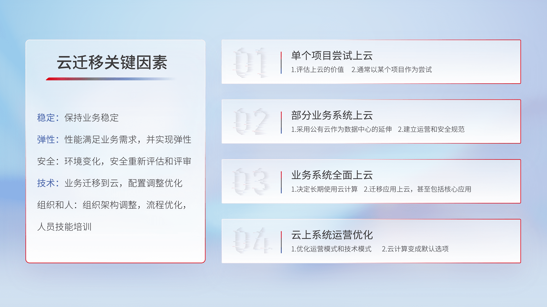 结合实际业务,,,,从规划设计、、、云平台选型、、、、云原生改造、、数据迁移、、、集成交付,,,迁移全过程为客户识别最佳上云路径,,做好风险识别管理,,,,设计网络架构、、身份权限、、、安全审计合规、、操作审计、、、、日志审计、、监控告警策略、、多站点容灾设计等,,对云上基础设施进行整体规划,,提升IT治理水平,,以满足弹性、、、高可用、、高性能的需求。。。。