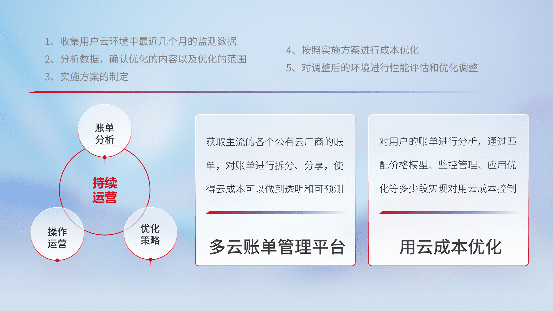通过多云纳管,,,以统一的资源数据模型把客户的云资源进行抽象和封装,,进而实现对多云资源的统一操作,,保障云资源管理的可靠性、、、、稳定性与可用性。。量身定制化运维内容,,,配置、、、开发运维、、、、补丁管理、、、、备份、、、监控、、认证和访问管理、、、、审计和日常巡检等,,,,保障在用云过程中的可靠度,,,稳定度以及高可用率。。。